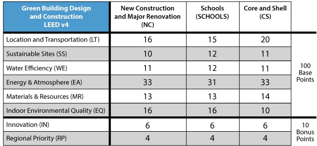 There are 100 base points, 6 possible Innovation and 4 Regional Priority points. The points cover the entire building process including everything from site selection all the way through building occupancy and are broken into 6 base categories and 2 bonus categories.